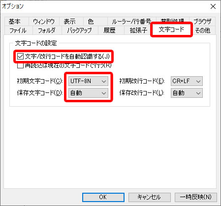 ③「文字コード」タブをクリック、「文字/改行コードを自動認識する」をチェック、初期文字コードを「UTF-8N」、保存文字コードを「自動」にします。