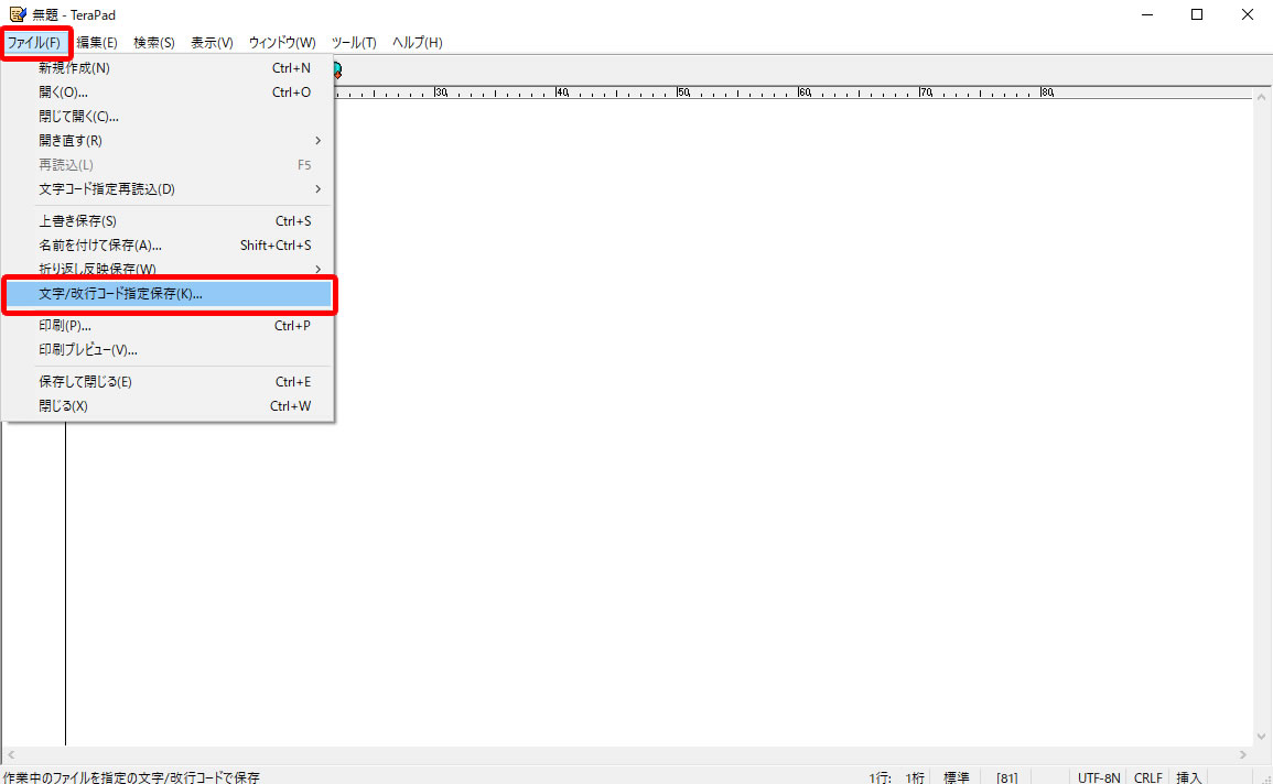 ④「ファイル」メニューから「文字/改行コード指定保存」を選びます。