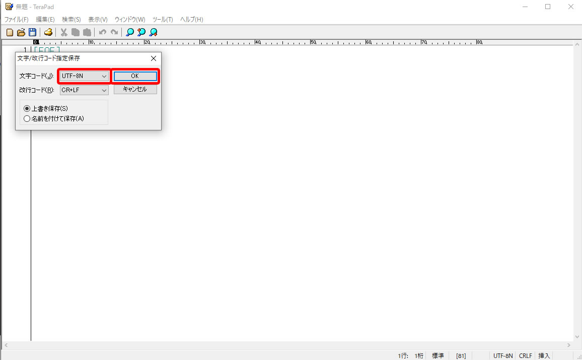 ⑤文字コードを「UTF-8N」にしてOKします。